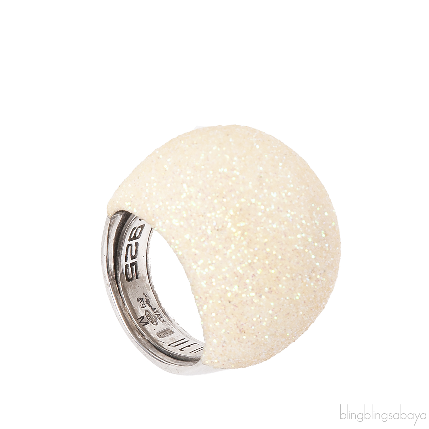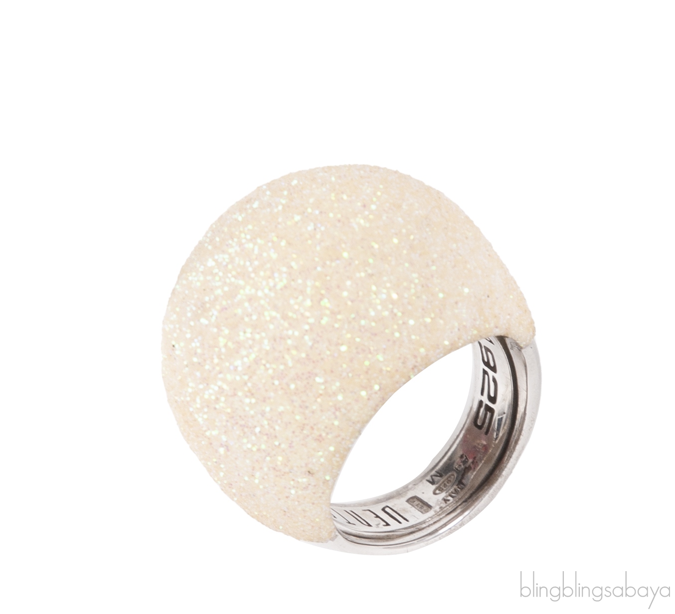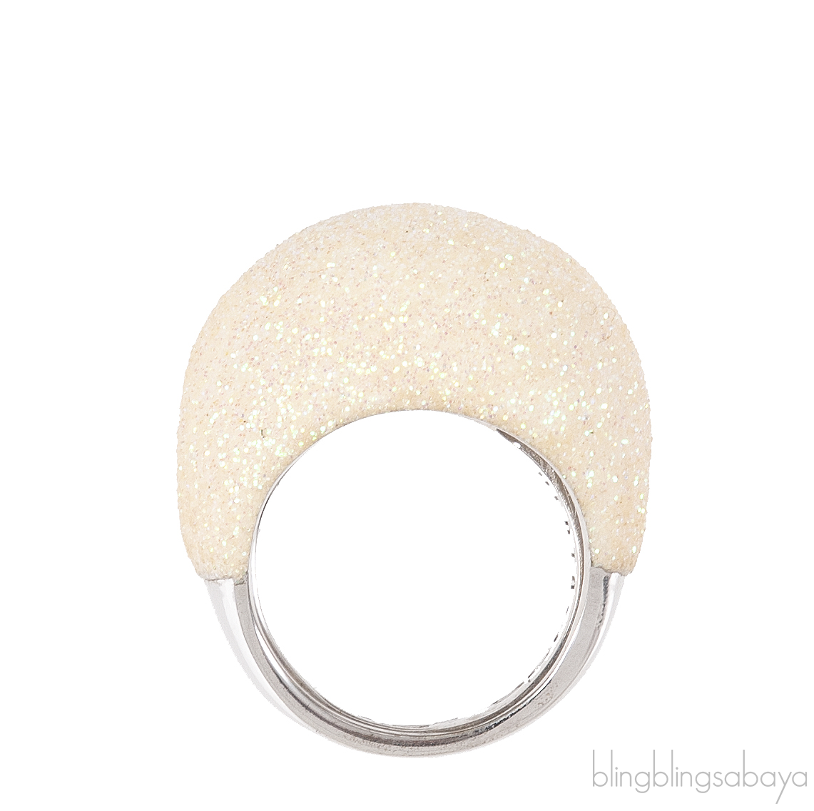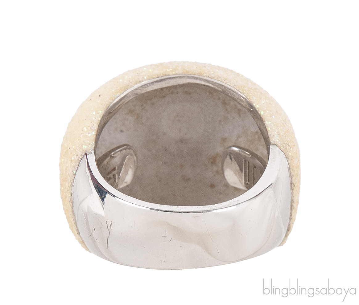 This Pesavento Polvere Silver Ring from Polvere di Sogni Colletion is crafted from sterling silver metal ring adorned with milk white glittery sandblasted enamel Antilope. All Pesavento Polvere di Sogni rings are fitted with an adjustable 'flex' for adjusting the ring.