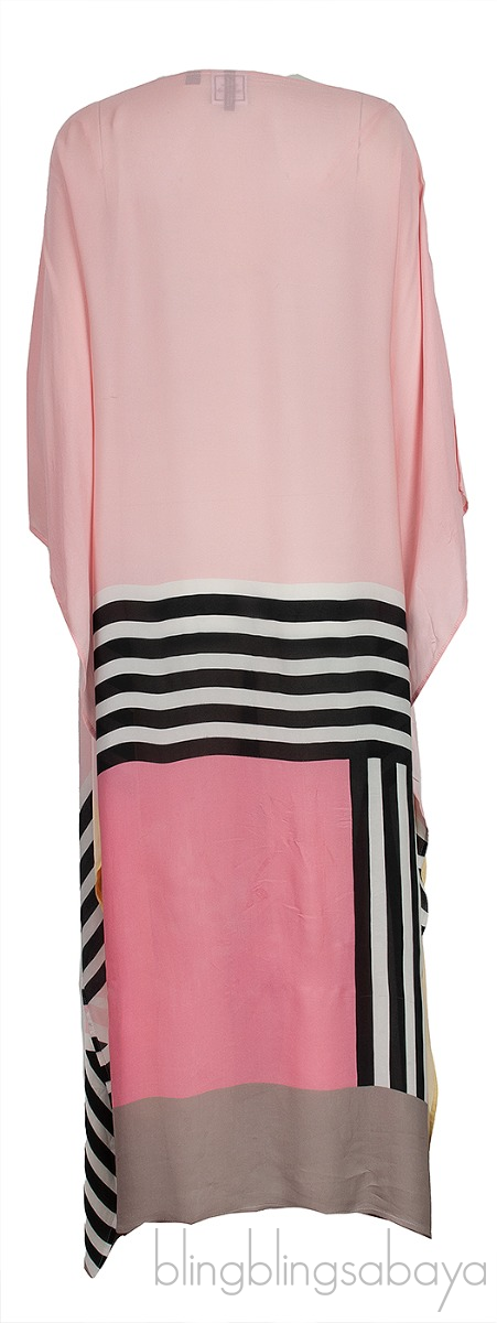 This Pink Printed Kaftan Dress from Louisa Parris is crafted from 100% Silk fabric featuring an abstract print in pink, yellow, grey, white and black color cut in a simple scarf dress shape with drape sleeves and a boat neckline