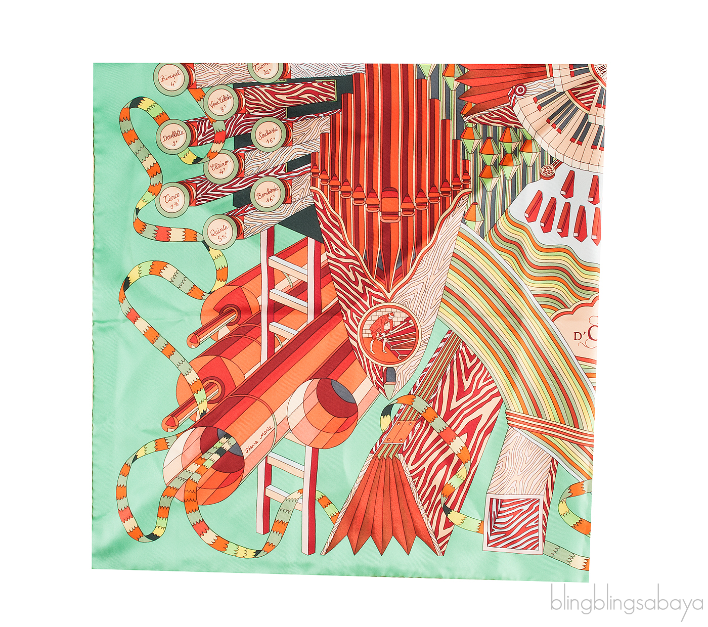 This Point D'Orgue Scarf from Hermes is crafted in 100% Silk fabric featuring an organ inspired design which is arranged with pipes, keyboards, bells and a clock in multi-color hue and green background.
