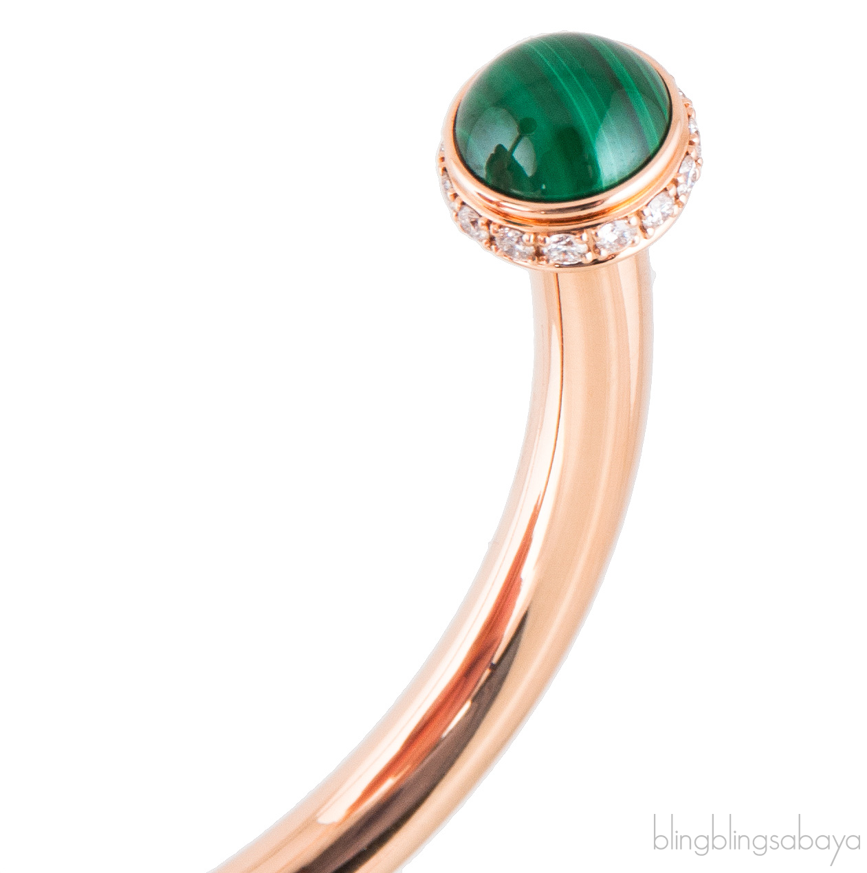 This Possession Open Bangle Bracelet from Piaget is crafted is preciously crafted in in 18K rose gold, set with 30 brilliant-cut diamonds (approx. 0.38 ct) and decorated with two malachite cabochons on both edges.