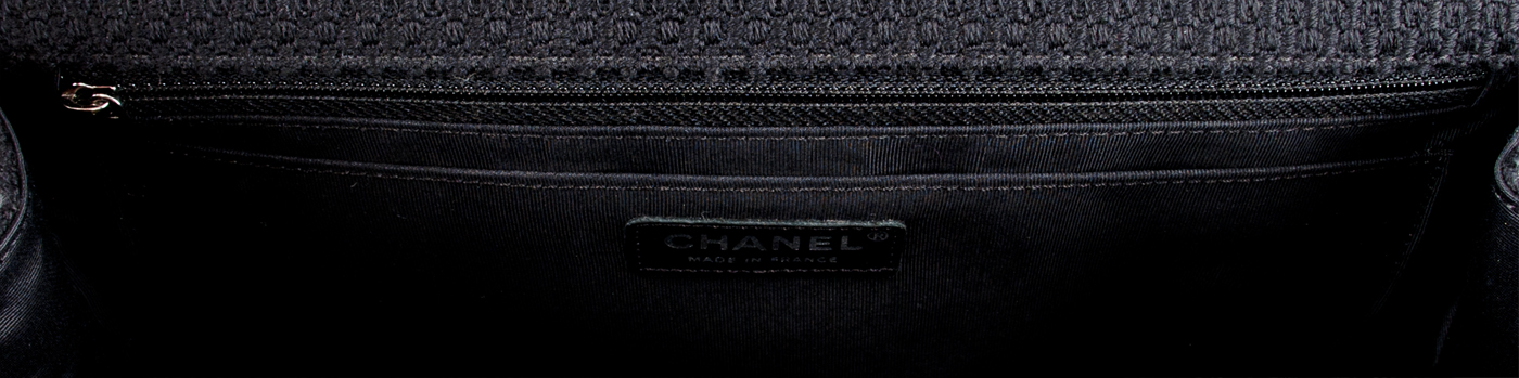 Incredibly striking Limited Edition Strass Crystal CC Logo from Chanel. This super limited purse is done in elegant Black Tweed with strass Swarovski crystal "CC" design embellishment. This stunning Classic Chanel features polished Rutenium Hardware with Mademoiselle classic chain.