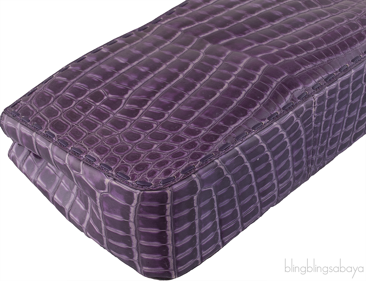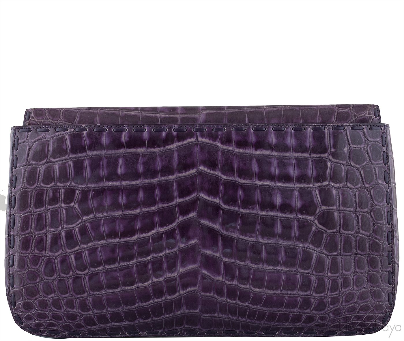This Purple Crocodile Handbag from Bottega Veneta is crafted from exotic purple crocodile skin leather. This stylish handbag features a dual gunmetal-tone mesh and chain handles and a flap cover. Interior is fully lined with suede fabric and has no pocket.