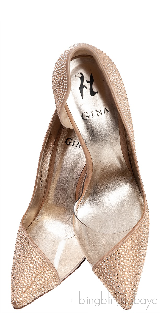 These Gold Crystal PVC Heels from Gina are crafted in PVC and leather upper. These heels features pointed toe and heels counter encrusted with crystal, leather lines insole, stiletto heels measuring 110 mm high and leather lined sole.