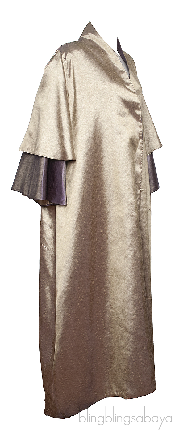 This Rabelle Metallic Bi-color Kaftan Dress is crafted from metallic greenish gold and purple fabric. This kaftan features an open front, layered bell sleeves, open front and maxi length.