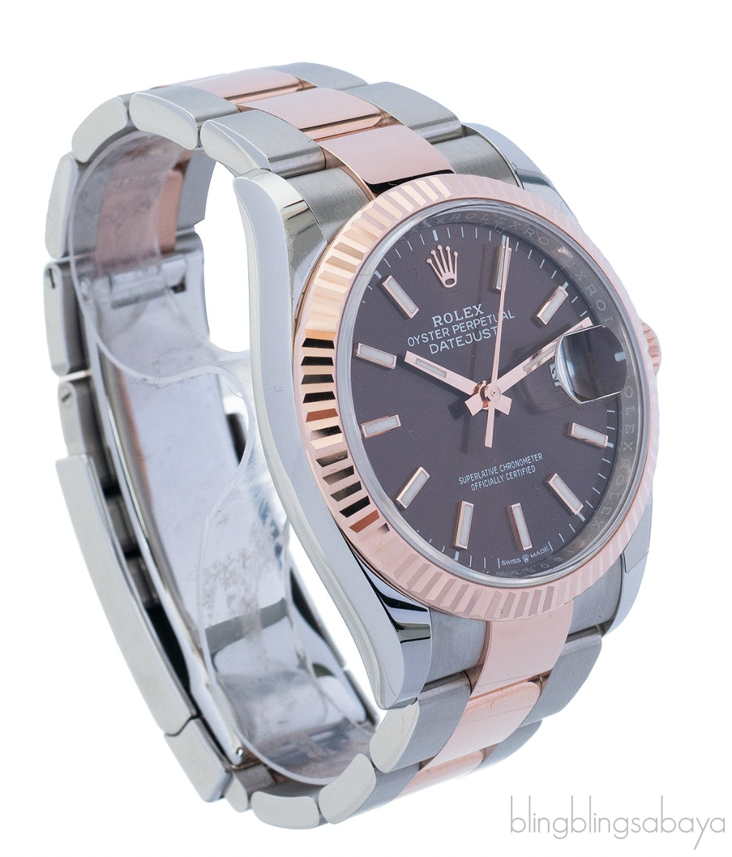 This Datejust 36 Oyster Perpetual Everose Automatic Watch from Rolex is crafted in oystersteel and rolesor everose gold 36 mm case and bracelet. This stunning watch features a fluted bezel and chocolate dial with sunray finish that creates delicate light reflections. It has an automatic movement, waterproof to 100 meters and approximately 70 hours power reserve.