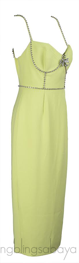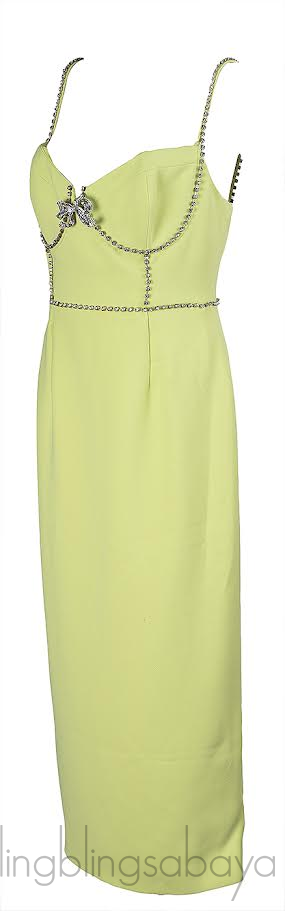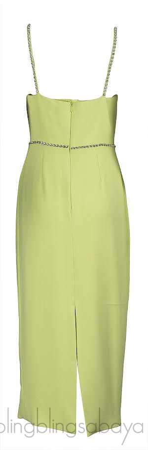 This Self-Portrait Bow Midi Dress in lime is crafted from 100% polyester and fully lined, featuring a notched bustier with diamanté bows and trim, a sleek column-style midi skirt, and a concealed zip fastening for a polished finish.