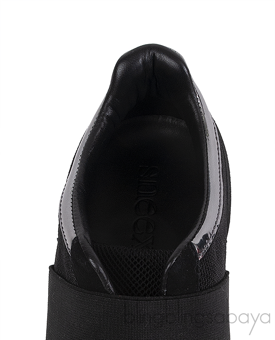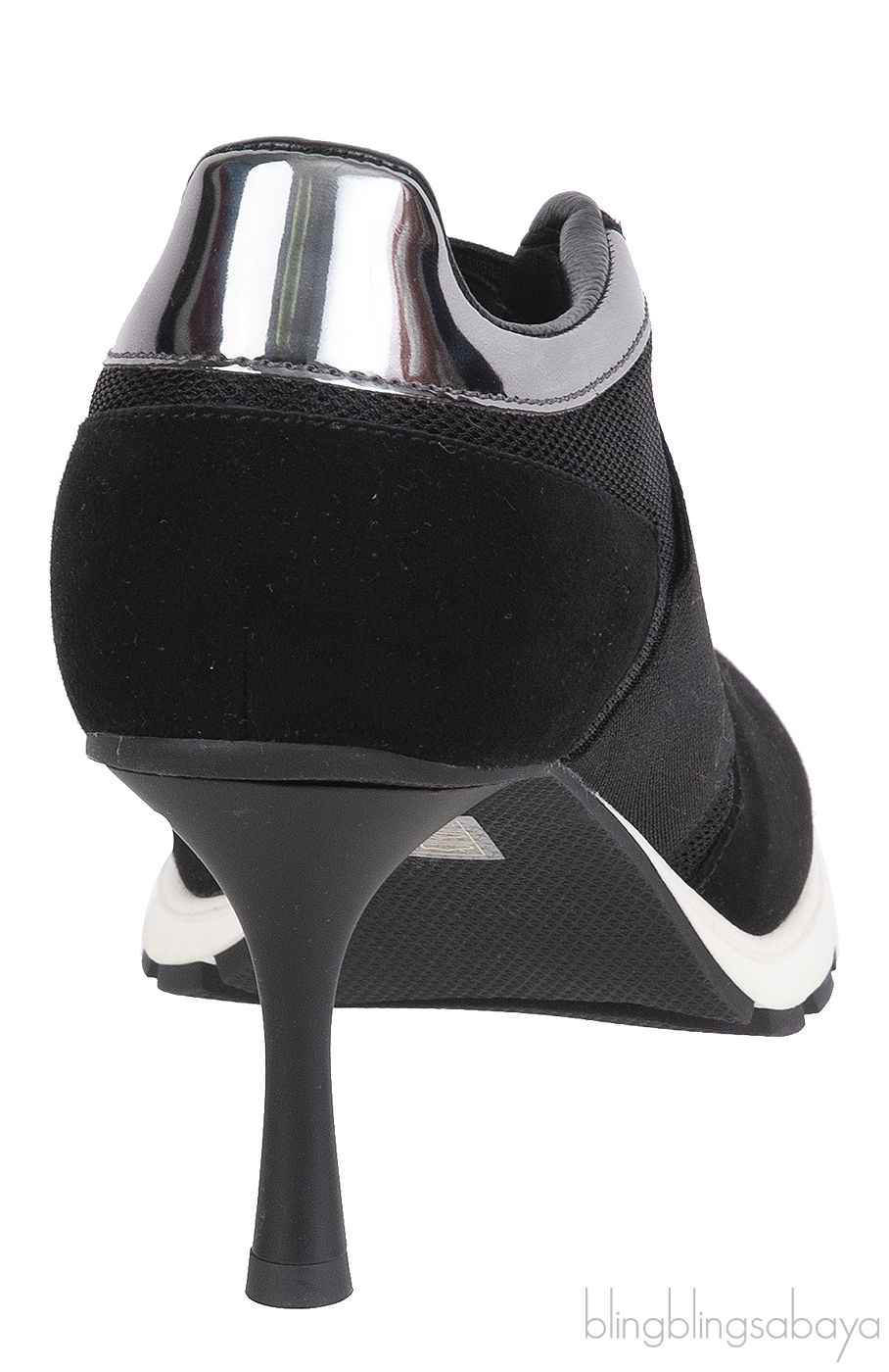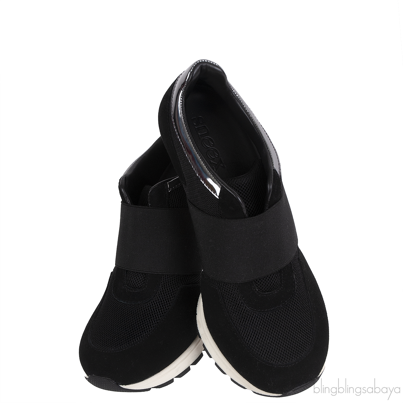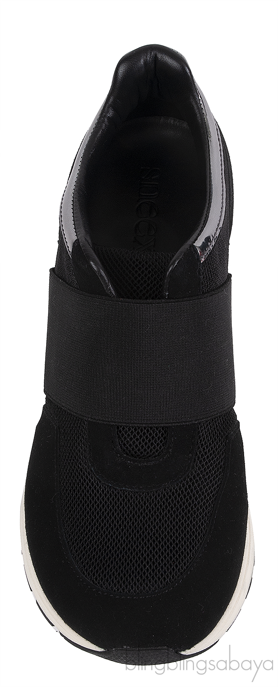These Sneex The Icon Hy-heel Black Sneaker is crafted from suede leather, mesh fabric, black elastic strap and silver metallic leather accent. This hybrid heels features a wide elastic strap with slip-on construction that hugs the foot, leather lined insole, slip-on, rubber like sole and 78 mm heels. This shoes has a comfortable toe box and arch support designed for elegance and ease.