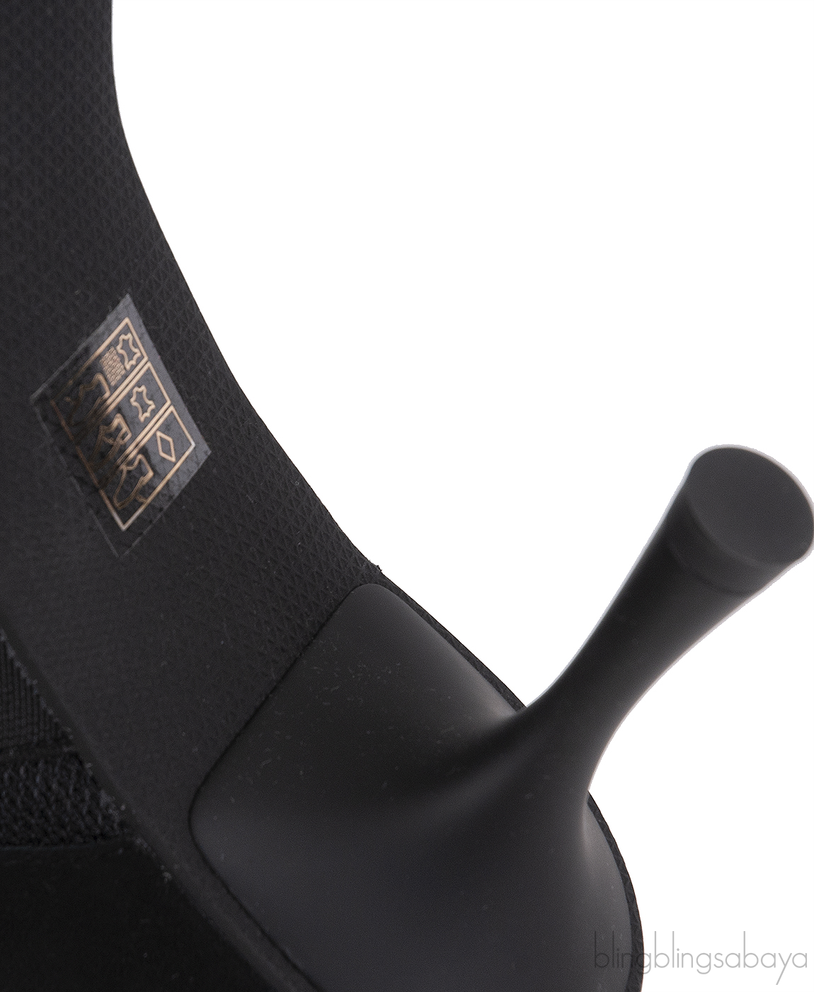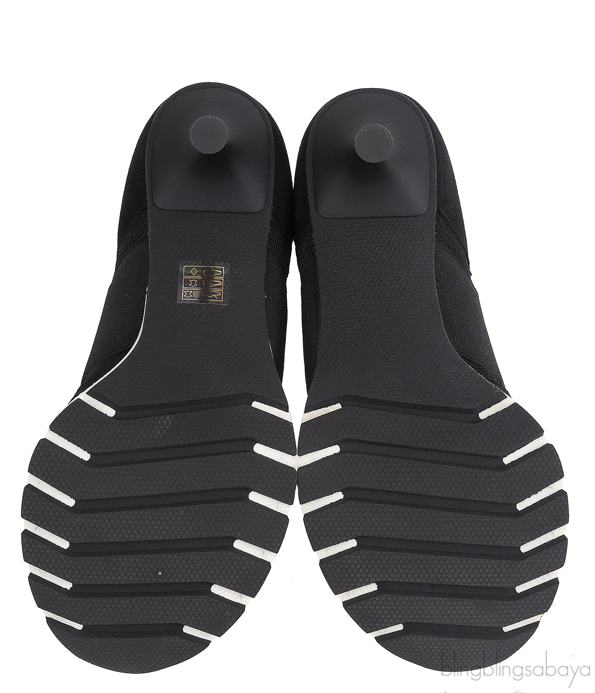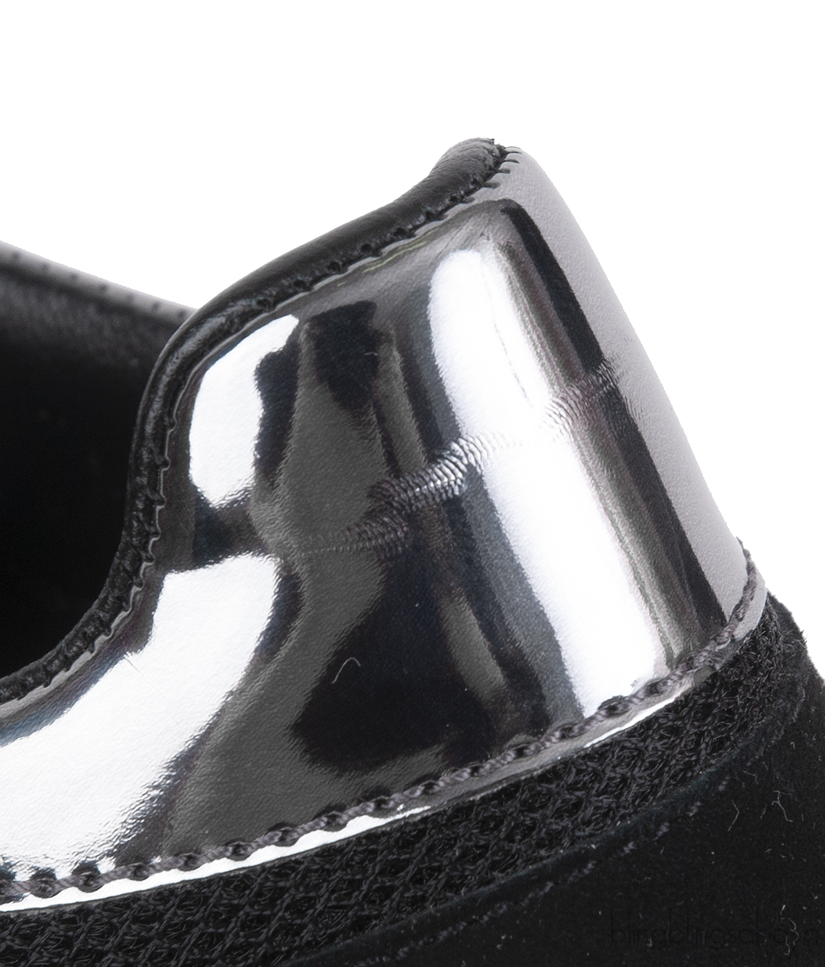 These Sneex The Icon Hy-heel Black Sneaker is crafted from suede leather, mesh fabric, black elastic strap and silver metallic leather accent. This hybrid heels features a wide elastic strap with slip-on construction that hugs the foot, leather lined insole, slip-on, rubber like sole and 78 mm heels. This shoes has a comfortable toe box and arch support designed for elegance and ease.