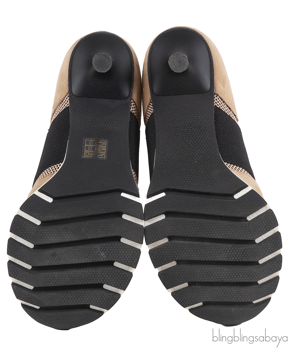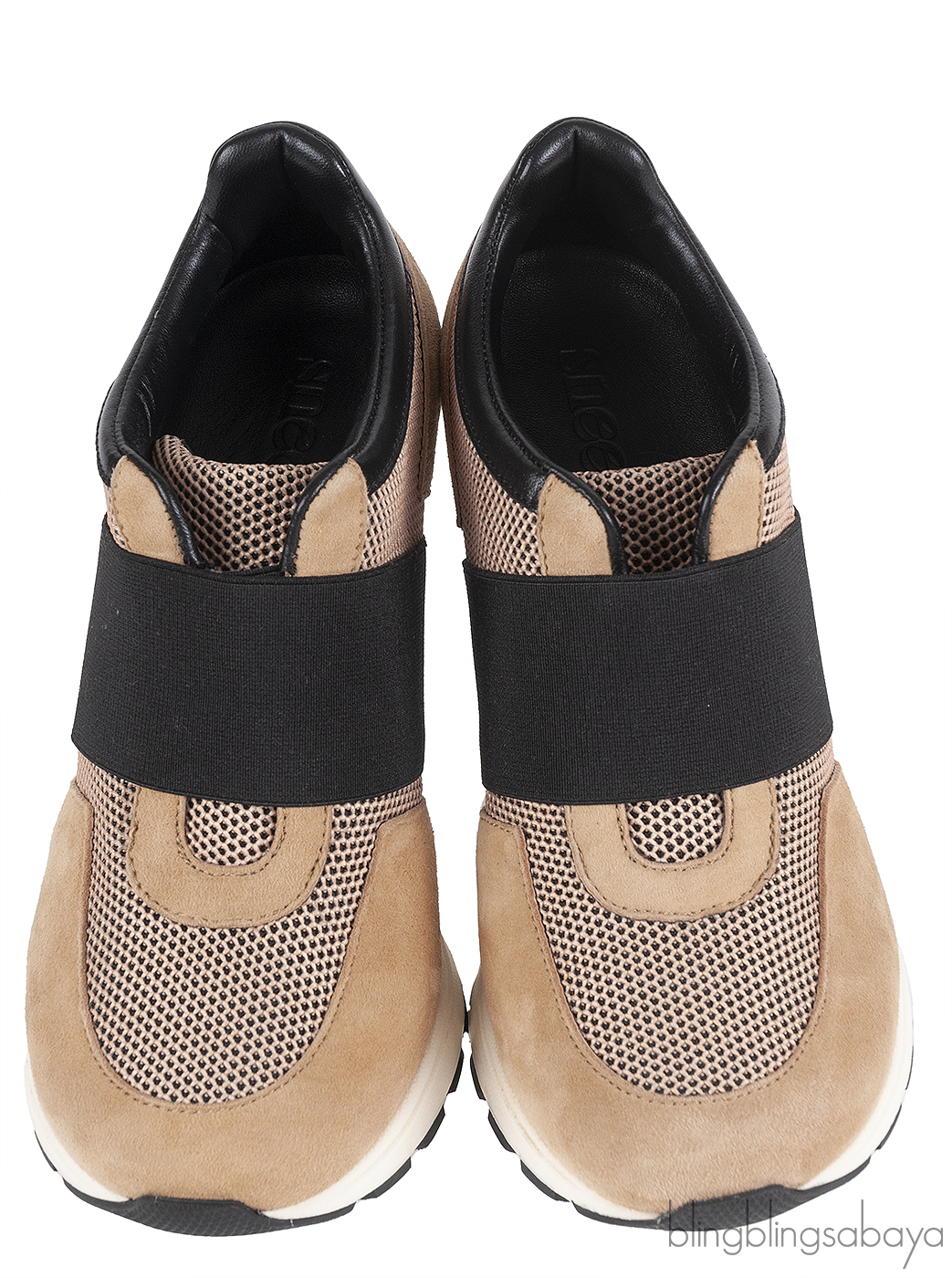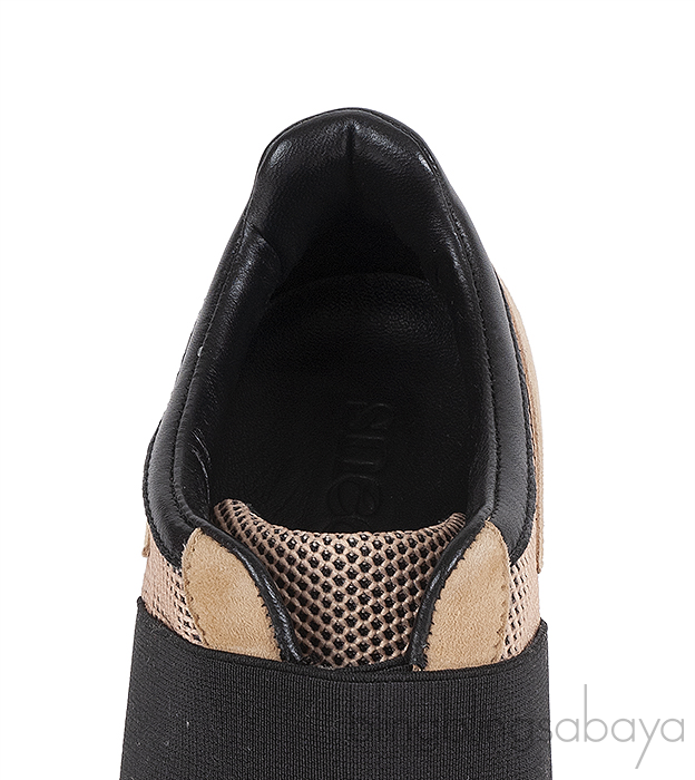 These Sneex The Icon Hy-heel Light Brown Sneaker is crafted from suede leather, mesh fabric, black elastic strap and black leather accent. This hybrid heels features a wide elastic strap with slip-on construction that hugs the foot, leather lined insole, slip-on, rubber like sole and 78 mm heels. This shoes has a comfortable toe box and arch support designed for elegance and ease.