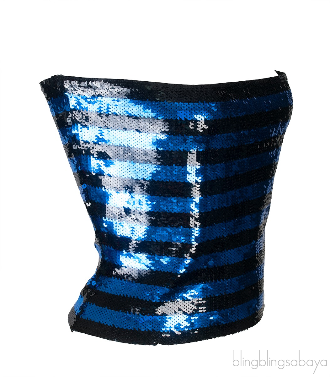 This Striped Sequined Tube Top from Yves Saint Laurent is crafted from 51% Viscose, 22% Polyester, 21% Polyamide and 6% Elasthane; Lining 100% Polyester. This sexy bustier top features a strapless design and a concealed side zip fastening in blue and back sequined embellished stripes.