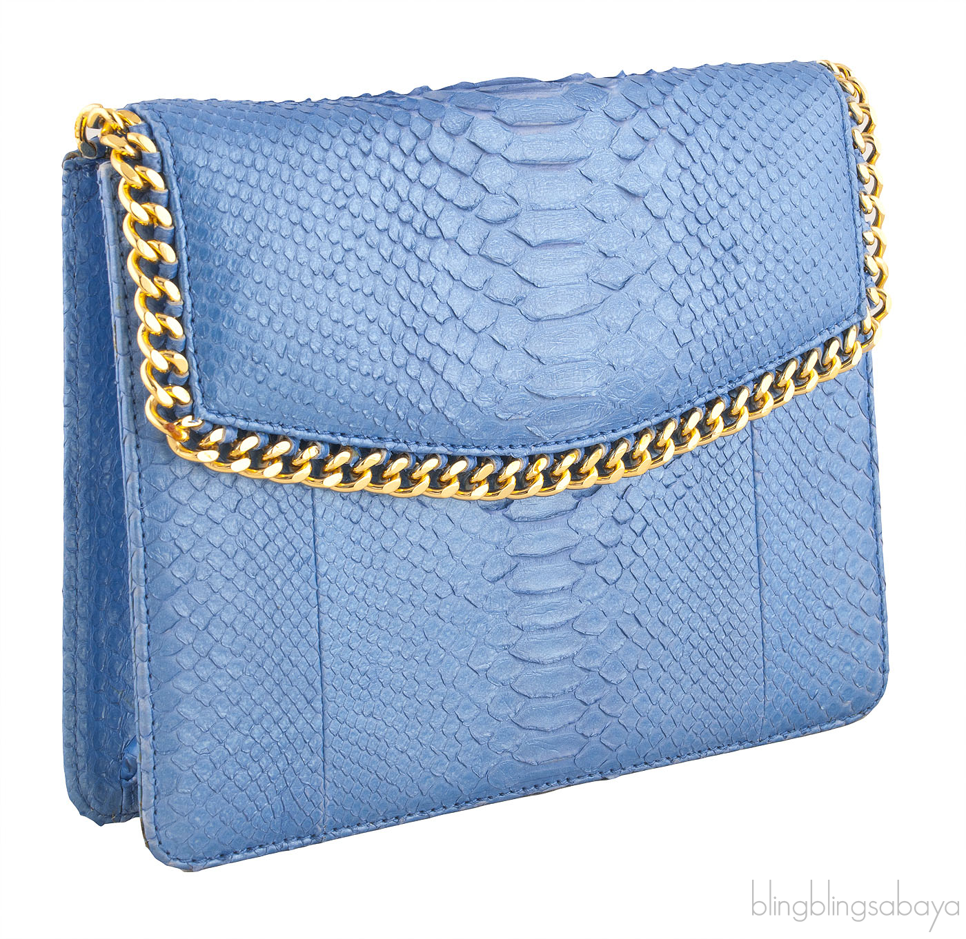 A glamorous piece that will mesmerize the people around you. This Cashhimi metallic blue python Shoulder clutch is a fabulous bag that features a clutch bag trimmed with golden chain inspired design in a python leather on the outside and suede leather on the interior.