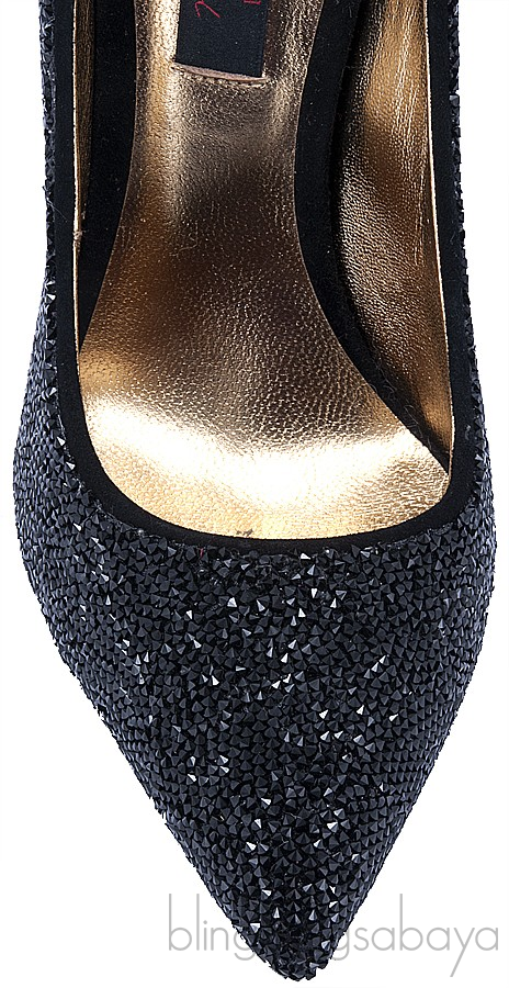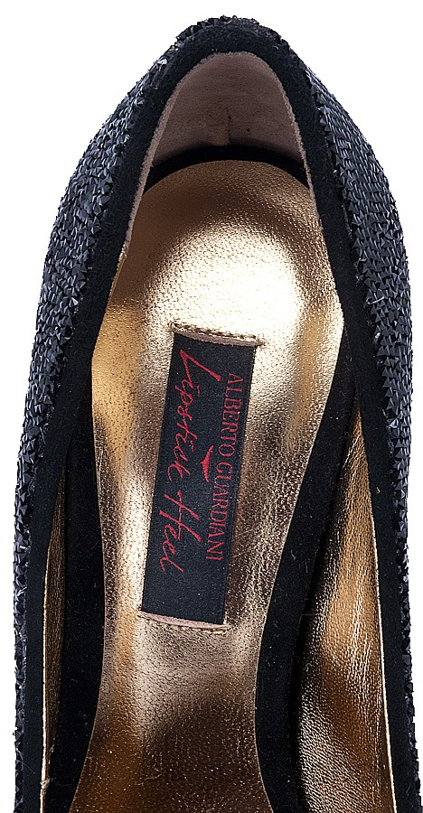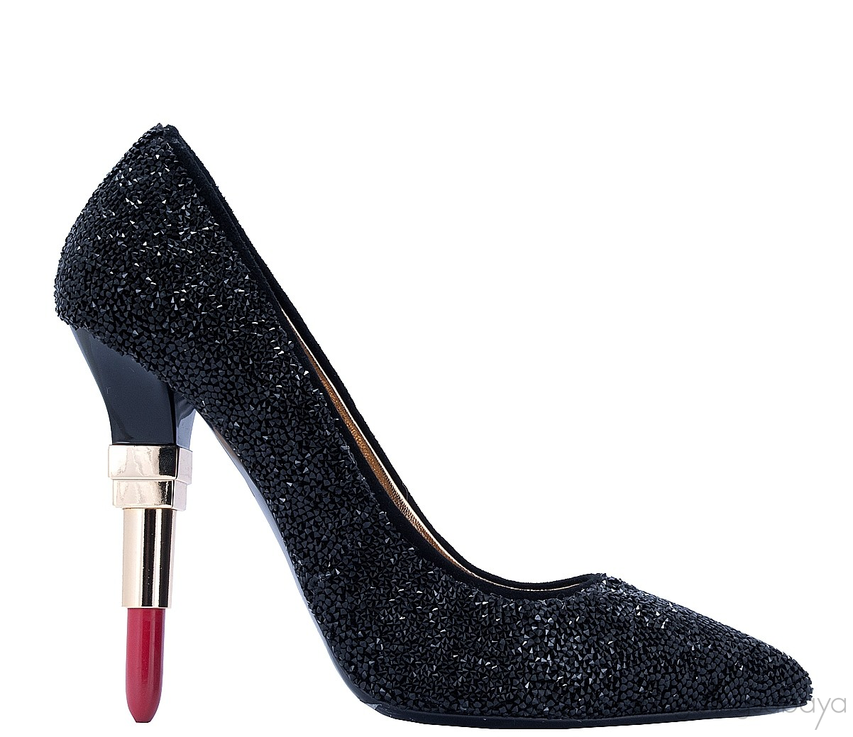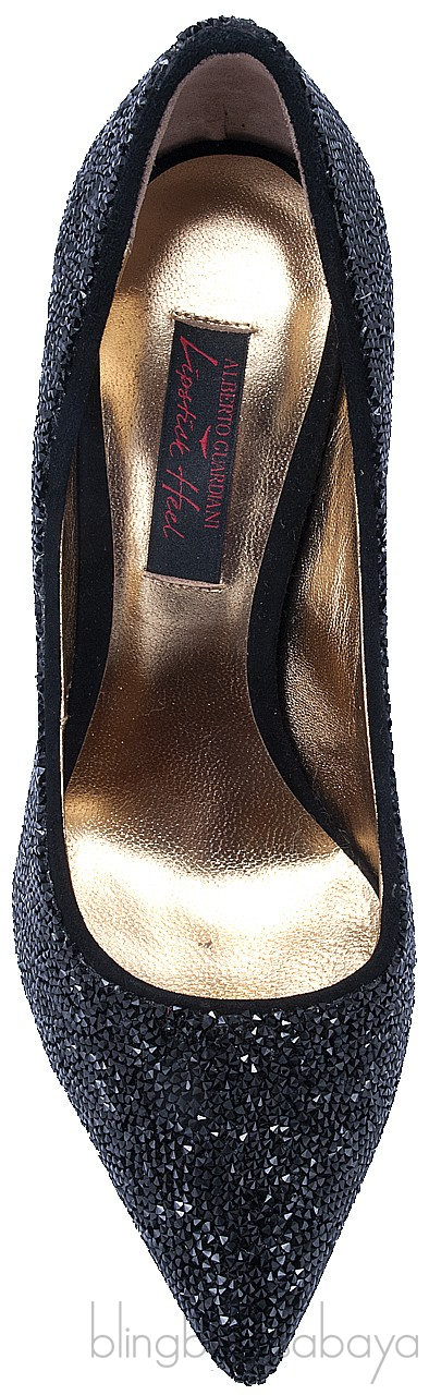 Creatively hot Swarovski Lpstick Heels from Alberto Guardiani is crafted in leather upper fully embellished with Black Swarovski Crystal Rocks. This features a leather lined insole, a pointed toe and and eye catching sexy lipstick heels.