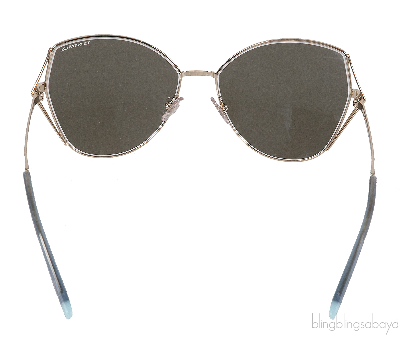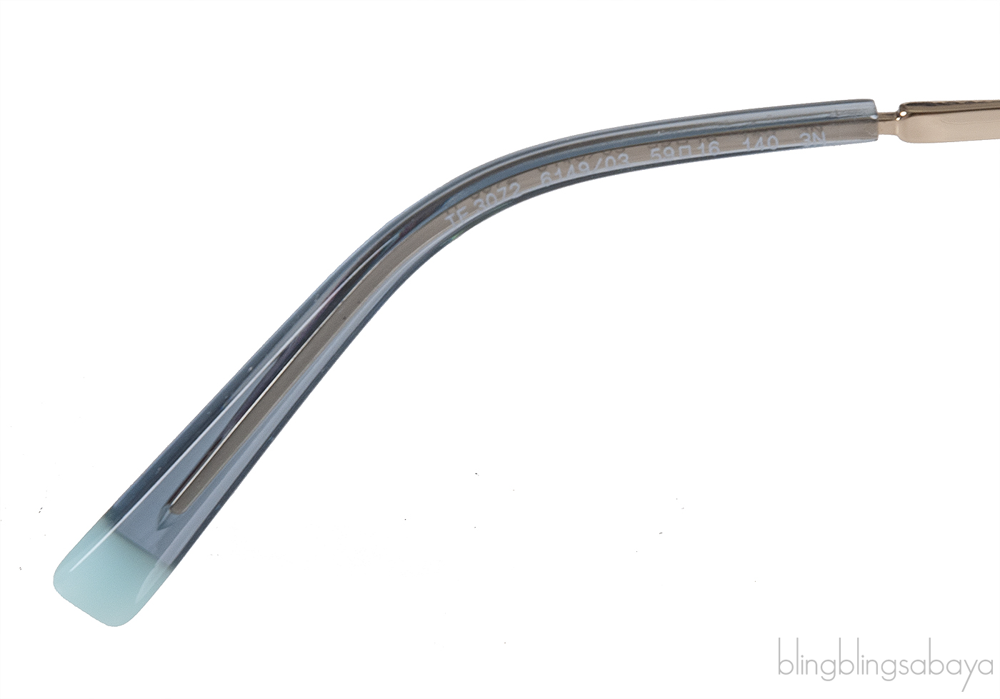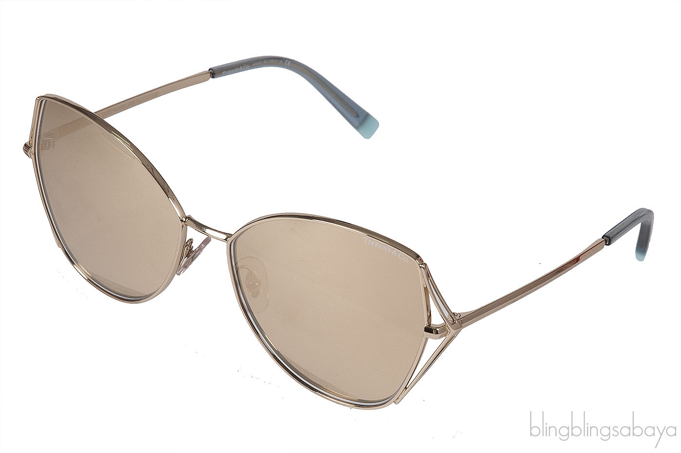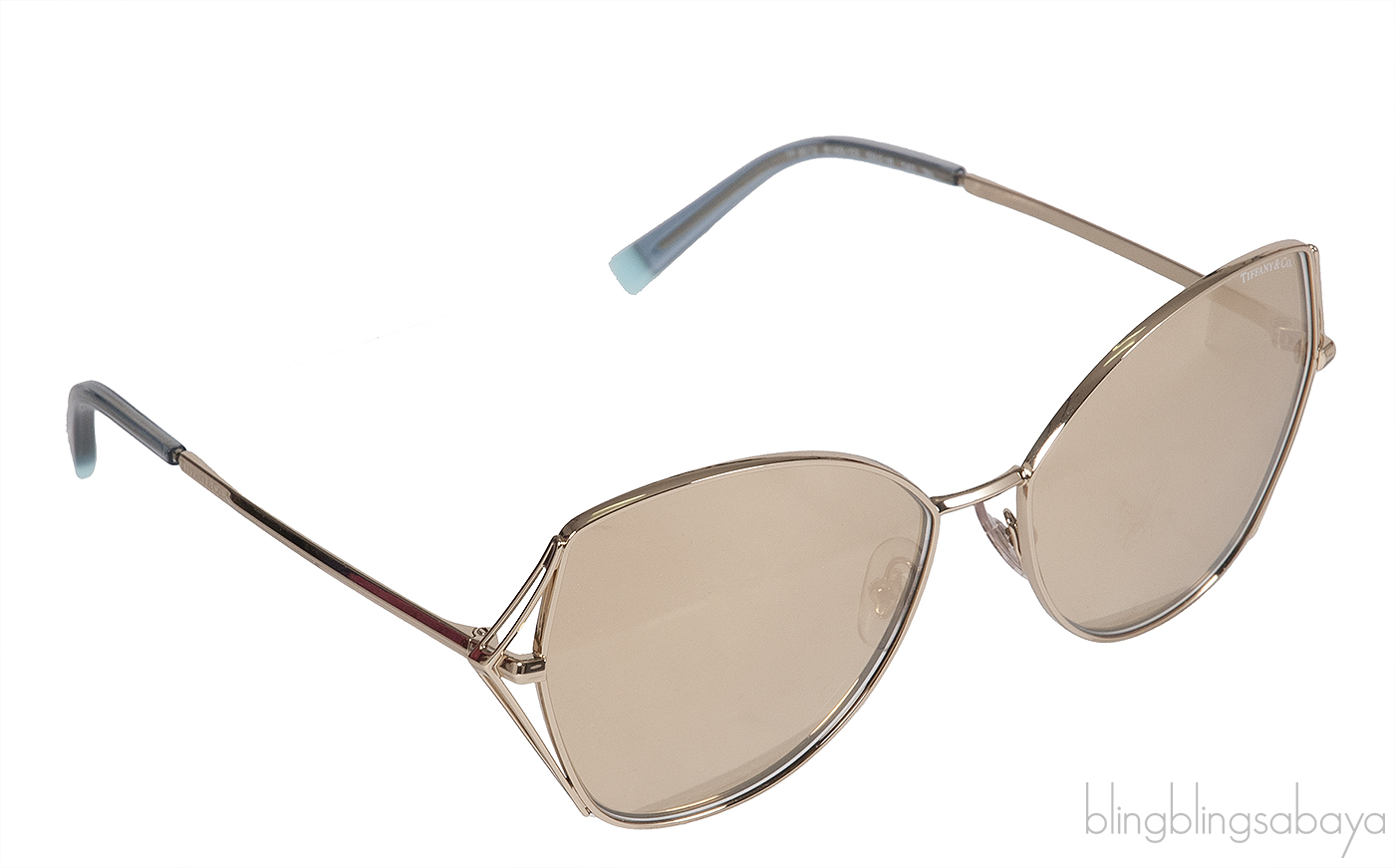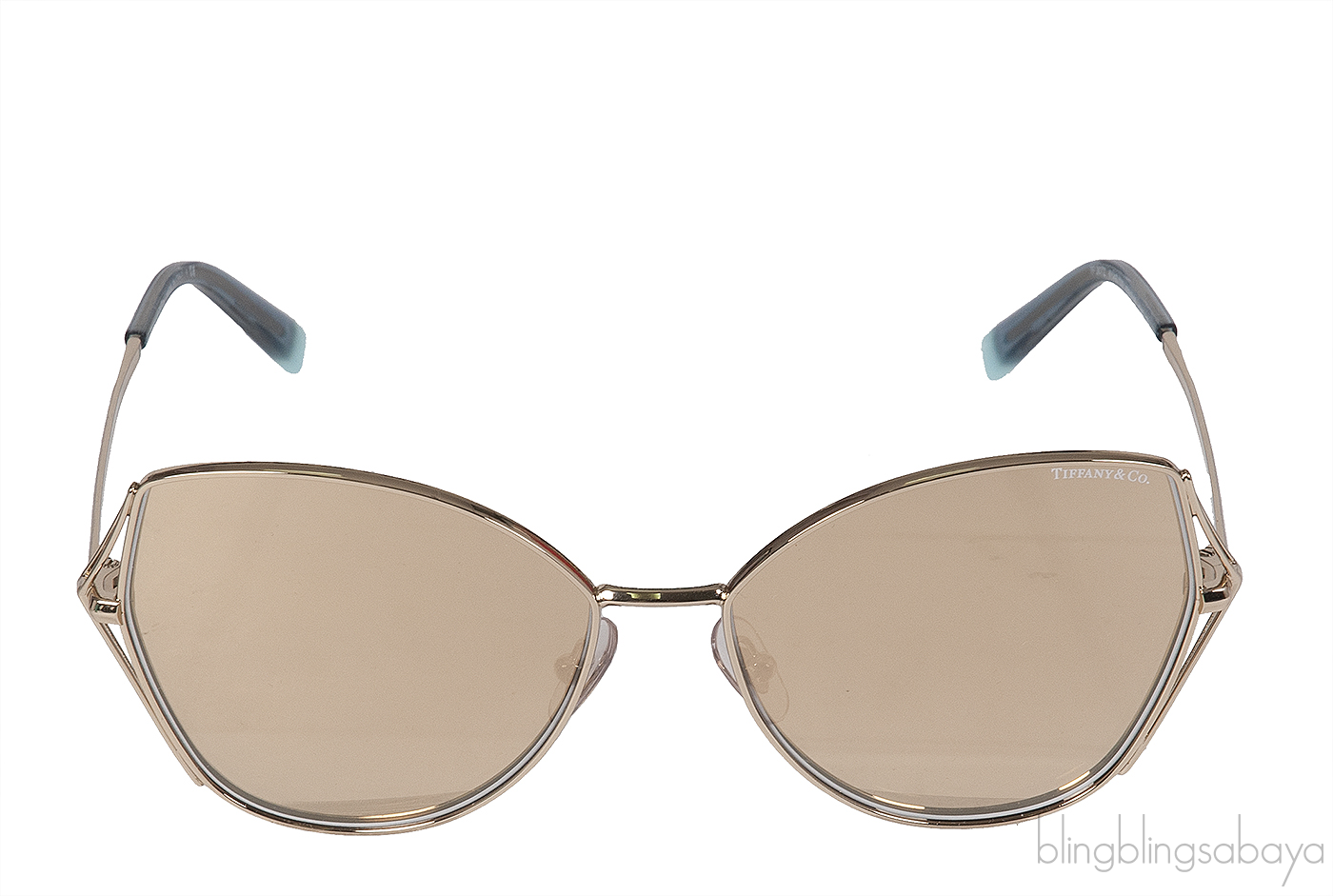 This Tiffany & Co. TF3072 Gold Sunglasses features a gold metal frame with gold mirrored lenses with soft adjustable nose pads, metal temple with blue tiffany acetate at the tip.