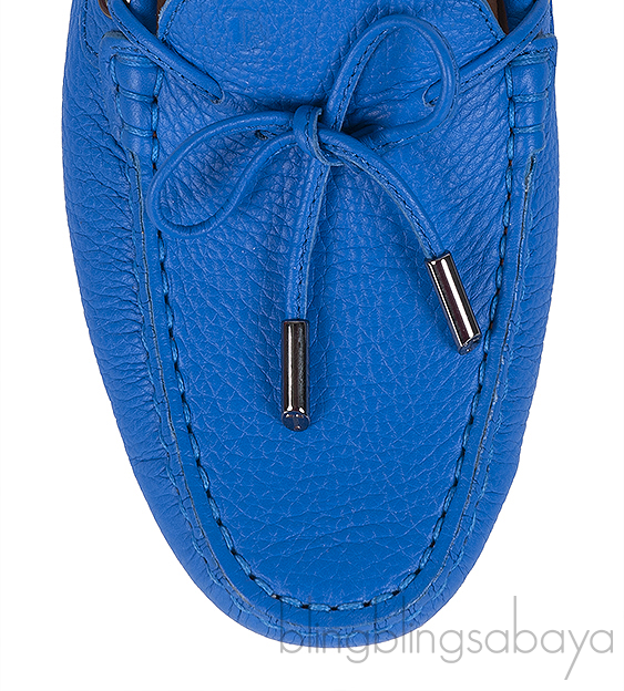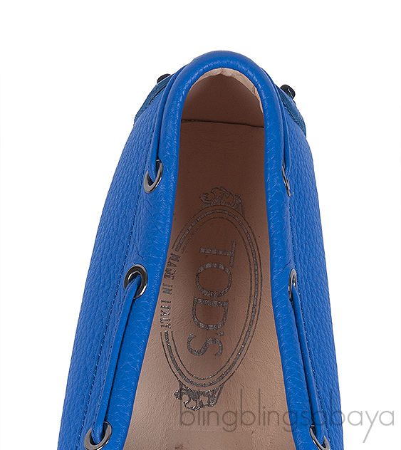 These Royal Blue Loafer Shoes from Tod's are crafted from royal blue leather upper with nude leather lining. This loafer features a closed round toe, coordinating stitching, string bow at the vamp logo silver stamp on the insole and pebbled rubber sole.