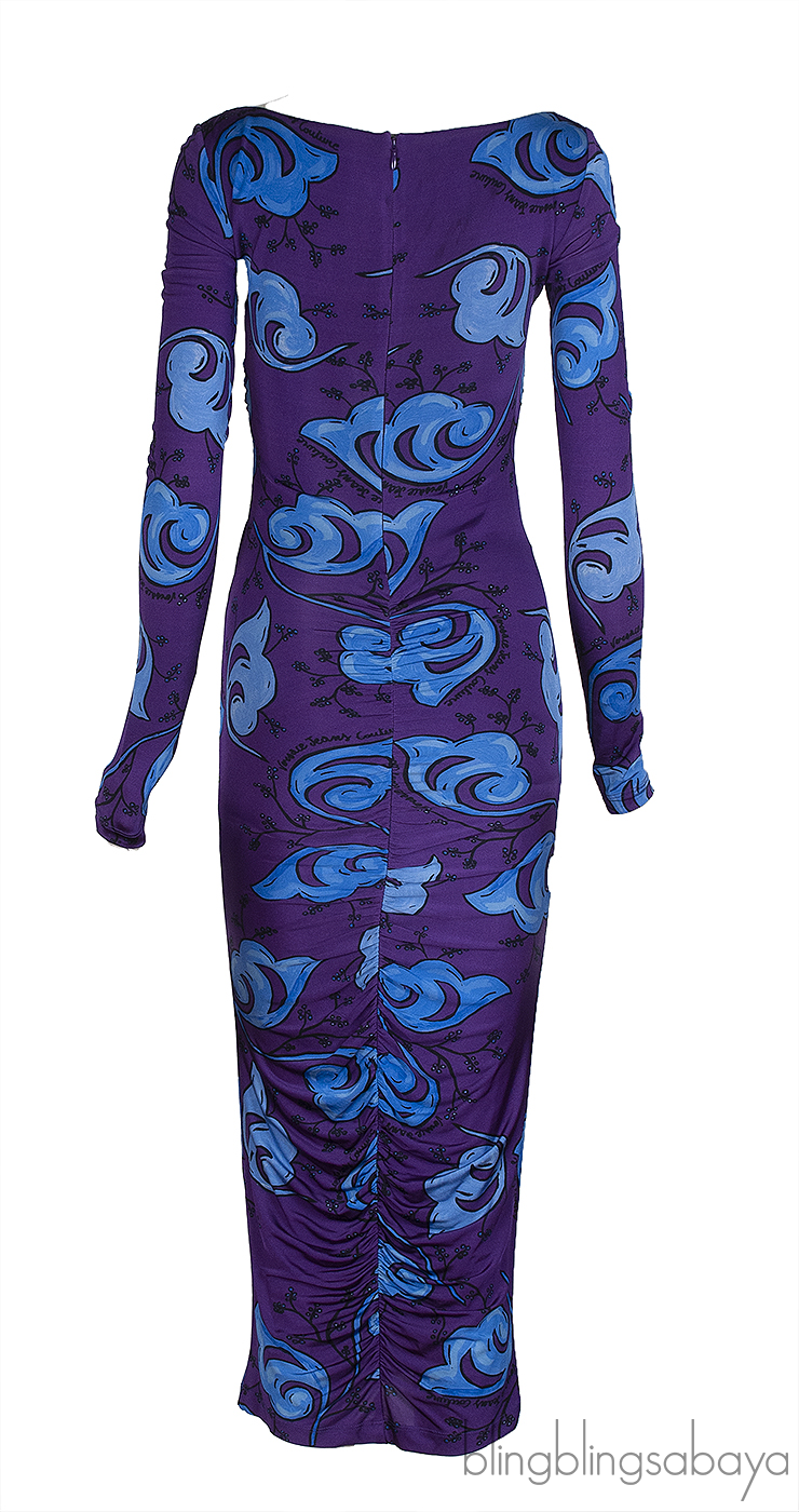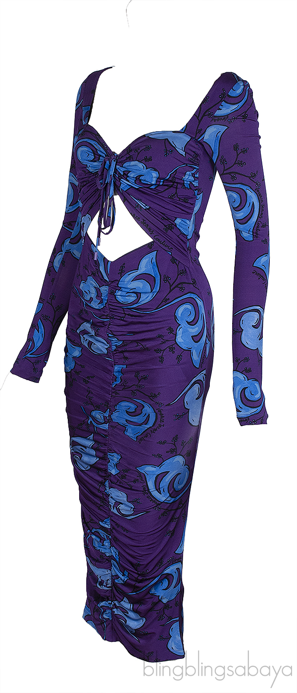 This Versace Jeans Couture Purple Print Cut-Out Dress is crafted from 96% Viscose and 4% Elastane in purple and blue hue. This dress features a sweetheart neckline with ties, cut-out at front, long sleeves, zip fastening at back, frilled effect and logo detail at back.