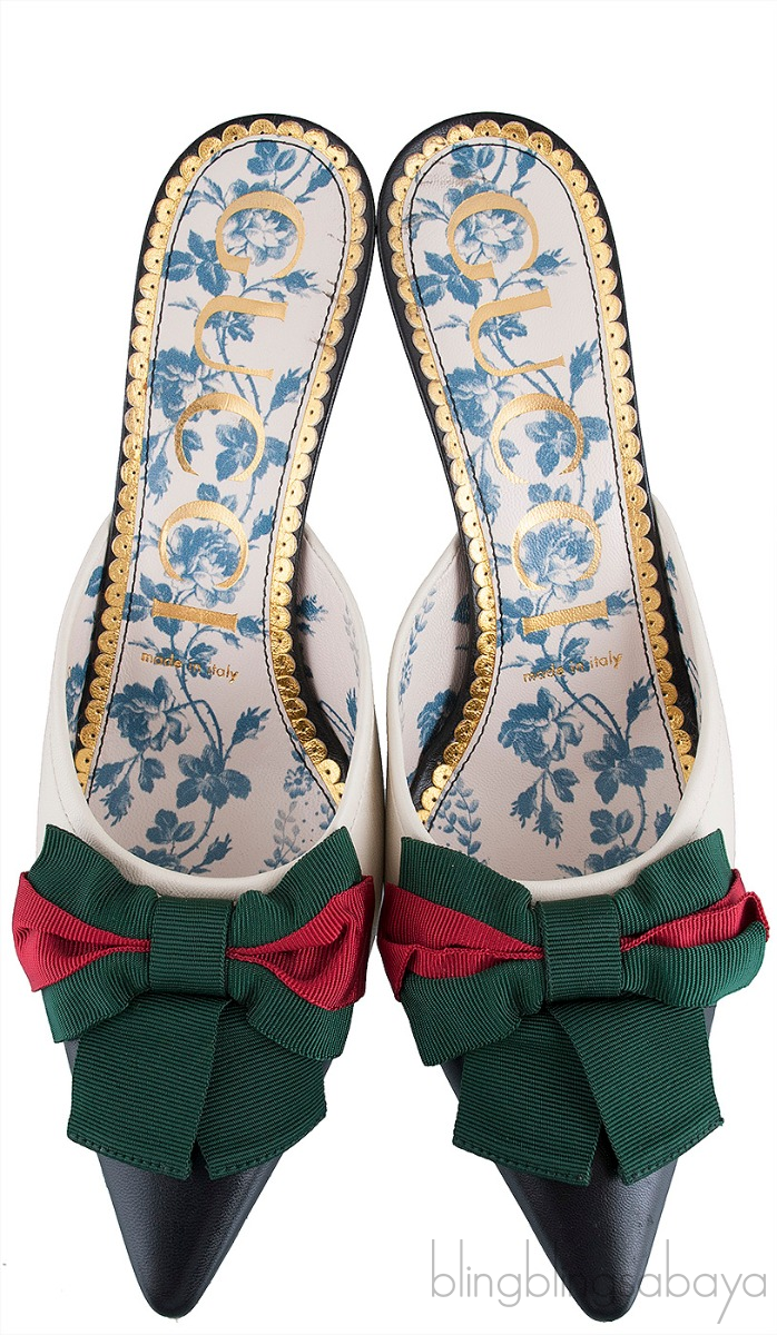 These Web Bow Slide Mules from Gucci are crafted from off-white and black cap toe leather with floral print leather lining. These stunning mule features a point toe, gross grain bow detailing at the vamp in red and green hue, floral print lining, brand printed on the insole in gold, leather lined sole and black covered heels measuring 100 mm high.