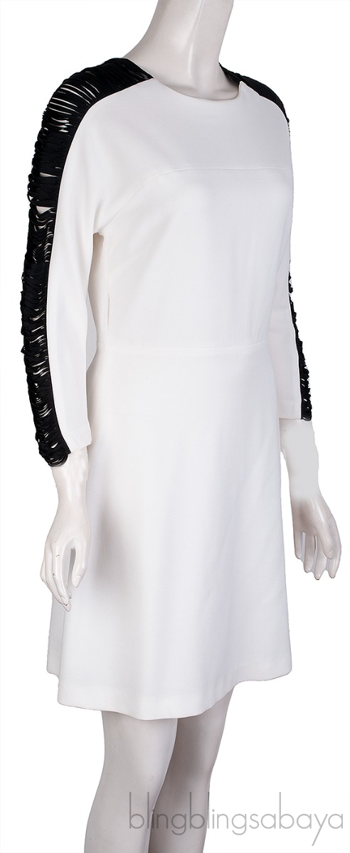 This White Cut-out Sleeves Mini Dress from Sandro is crafted from 65% Polyester, 32% Viscose & 3% elastane in white color. This dress features a round neckline, zip fastening at rear, long sleeves with constrasting black detailing and mini length.