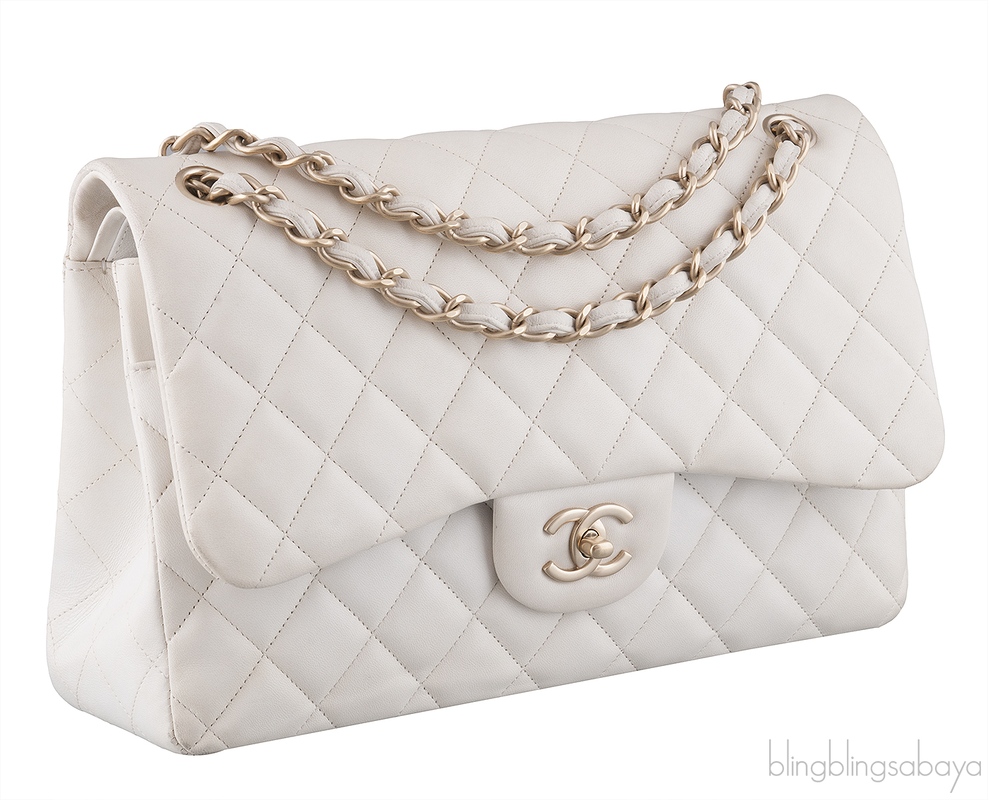 This Chanel Double flap bag is crafted from white quilted Lambskin leather with Gold Hardware. It features a famous twist lock CC closure and has a double chain linking shoulder strap that is interlaced with lambskin leather.