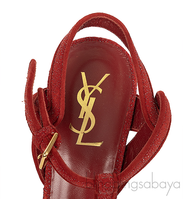 This pair of Red Glitter Finish Black Leather Tribute from Yves Saint Laurent is crafted in red leather upper with glitter finished and red leather lining. This features an open toe with wide straps loop together over the vamp, adjustable T-strap with the golden buckle, padded insole and leather sole.