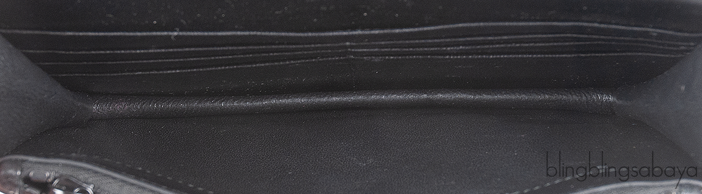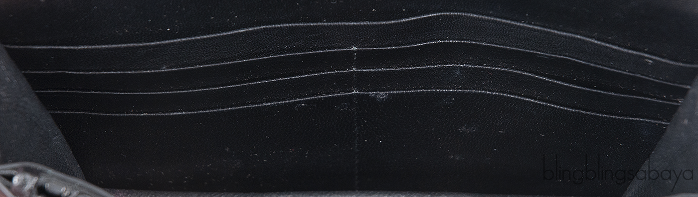This stunning piece features a so-black wallet on chain with flap magnetic closure adorned with YSL black metal log. It has the long chain shoulder strap for a clutch use. Interior is fully lined with leather and has six credit card slots, bill fold slot and a zip pocket.